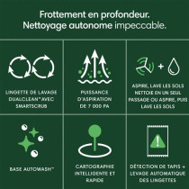 Grâce à ses lingettes rotatives DualClean™ et à la technologie SmartScrub, le nettoyage est jusqu’à deux fois plus puissant* qu’en mode standard. Le robot détecte automatiquement les tapis et évite d’y passer la serpillière pour un entretien adapté. *Par rapport au mode aspiration et lavage standard pour le café.